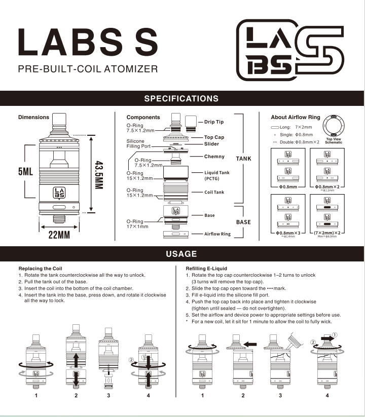 The LABS S Tank is a prebuilt coil atomizer engineered to deliver an authentic 'Italian-style MTL' experience in low-wattage, tight-airflow MTL setups, capable of matching the performance of high-end rebuildable atomizers. It features light, smooth, and quiet airflow, producing a dry, crisp and well-layered , while avoiding excessive sweetness when used with tobacco-flavored e-liquids.